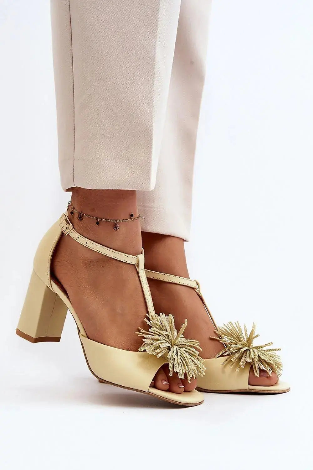 Women's sandals made of natural leather. Set on a heel in the form of a post. Fastened with an adjustable strap with a buckle. Model with covered heel. Ornament on the front. The leather insole will ensure comfort during use. You can match this cut with elegant pants, skirts and dresses.