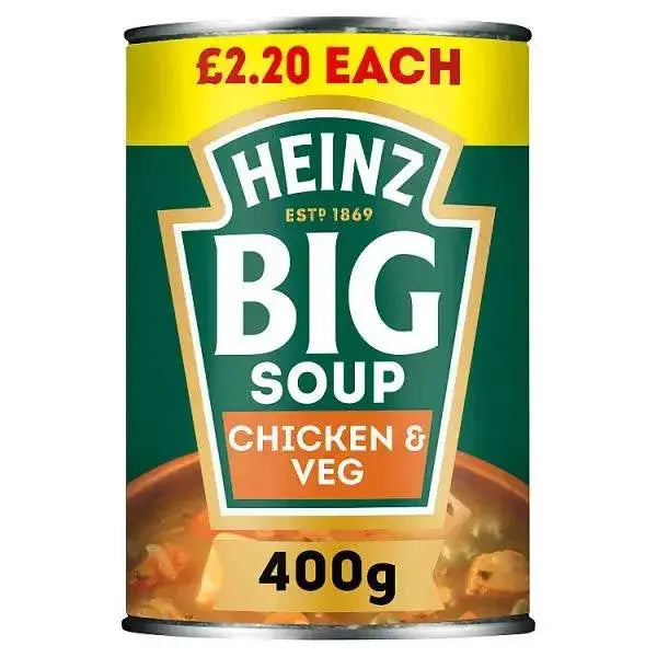 Satisfy your hunger with Heinz Big Soup Chicken & Vegetable. Made with tender chicken, hearty vegetables, and a savory broth, this convenient pack of 12 cans is perfect for busy days. With a portion size of 400g per can, it's a wholesome and delicious meal option.