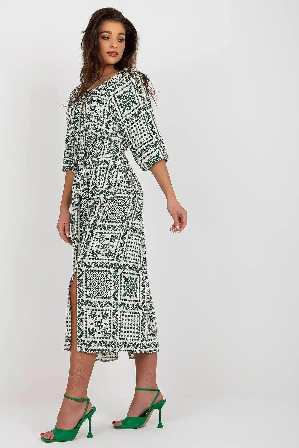 Lakerta simple midi cut summer boho daydress is the perfect choice for everyday styling. Its simple midi cut with buff 3/4 sleeves and round neckline creates a light, airy look. The predominant print adds to its charm, and the main material - viscose, provides comfort and breathability on warm days. The dress is comfortable and stylish, decorated with a tie belt that accentuates the waist. It will be perfect for summer walks and meetings, adding lightness and romance to your daily closet.