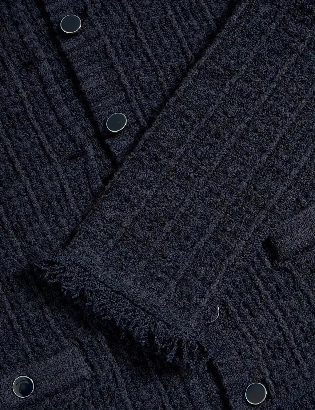 Add a touch of texture to your outfits with this cotton-rich knitted jacket. It's designed in a regular fit, with a timeless crew neckline and secure button fastenings. The two mock pockets on the front offer a practical touch. Fringe detailing on the hem and cuffs completes the stylish look. M&S Collection: easy-to-wear wardrobe staples that combine classic and contemporary styles.