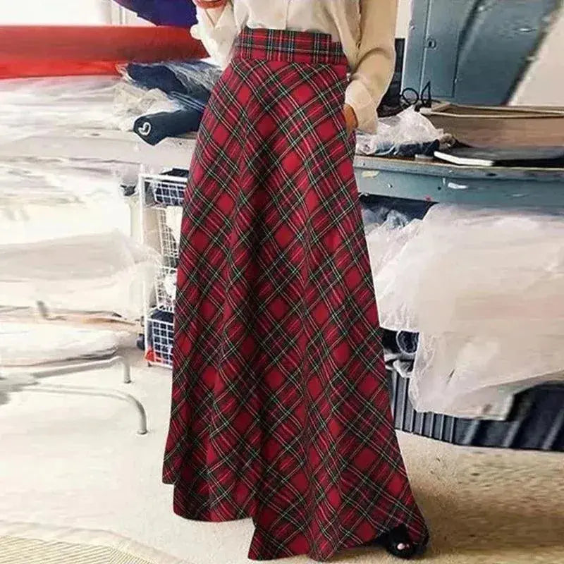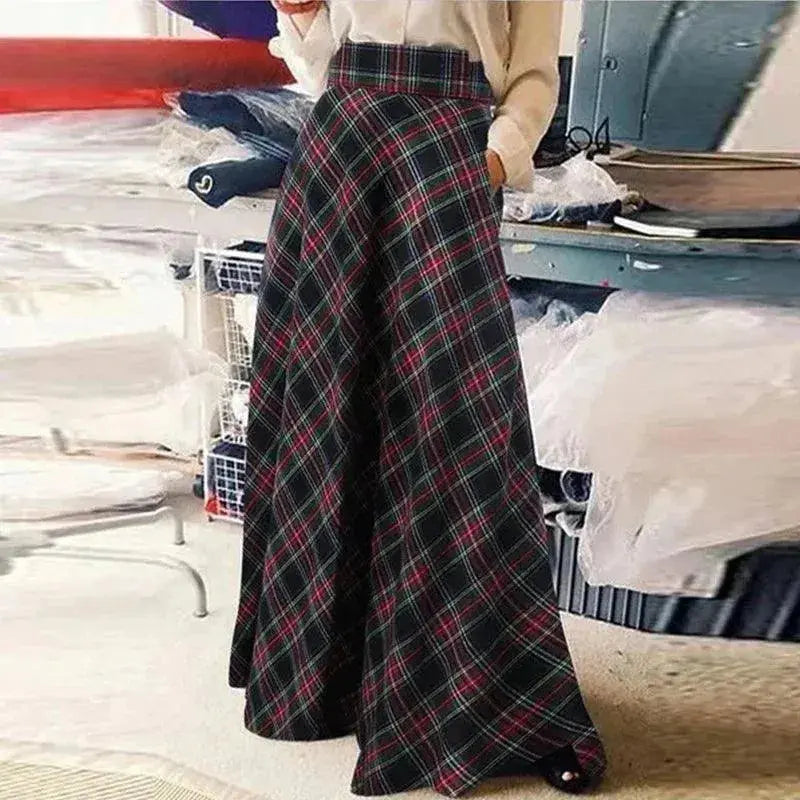 -Features:Autumn and winter high waist pockets checkered umbrella leaf A-line skirt